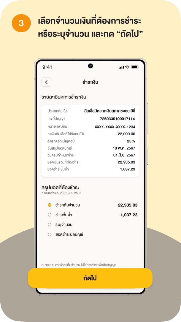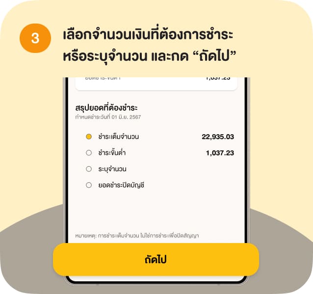 เลือกจำนวนเงินที่ต้องการชำระ หรือระบุจำนวน และกด “ถัดไป”