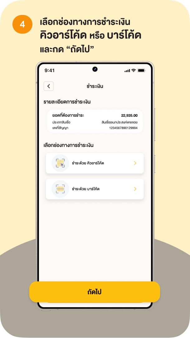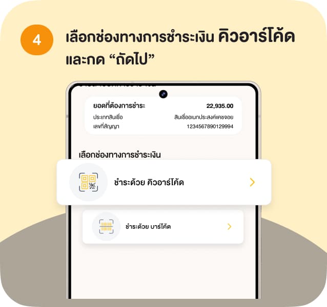 เลือกช่องทางการชำระเงิน คิวอาร์โค้ด หรือ บาร์โค้ด และกด “ถัดไป”