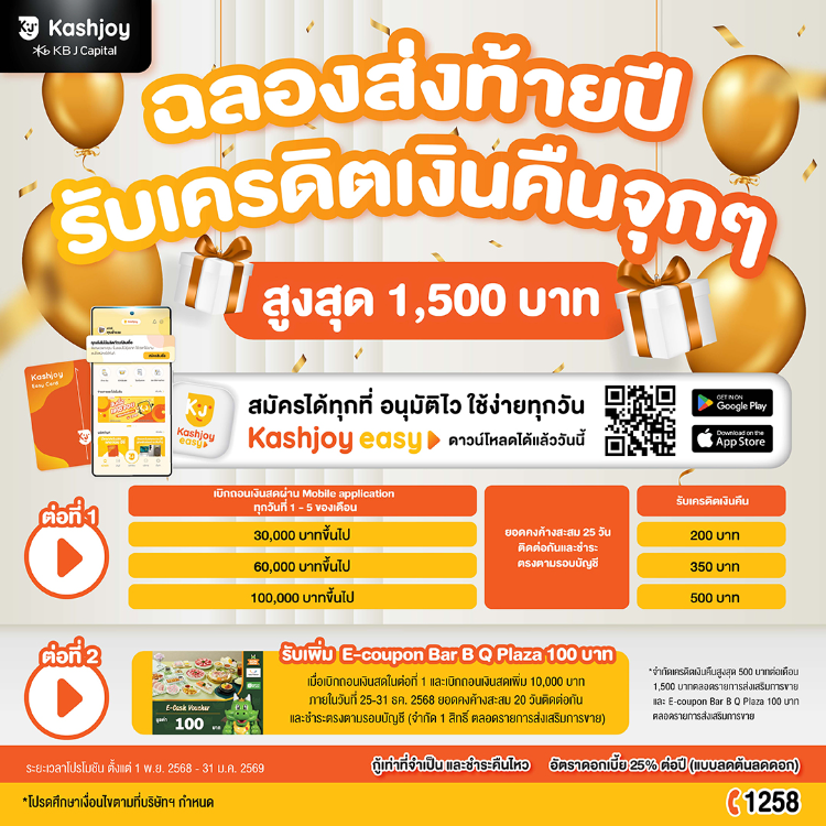 • เอกสารแสดงรายได้- สำเนาสลิปเงินเดือน หรือสำเนาหนังสือรับรองเงินเดือน (ที่แสดงเงินเดือนล่าสุด หรือออกไม่เกิน 2 เดือน) และสำเนารายการเดินบัญชีธนาคารที่แสดงเงินเดือน ย้อนหลัง 3 เดือนล่าสุดติดต่อกัน- ในกรณีที่ไม่มีสลิปเงินเดือน ใช้สำเนารายการเดินบัญชีธนาคารที่แสดง Code เงินเดือน ย้อนหลัง 6 เดือนล่าสุดติดต่อกัน• สำเนาสมุดบัญชีหน้าแรกของธนาคารที่ต้องการให้โอนเงินสินเชื่อ - - กรณีลูกค้าสมัครขอสินเชื่อผ่านช่องทาง จุดให้บริการ POS บริษัทฯ จะแจ้งผลการพิจารณาอนุมัติสินเชื่อ ภายใน 1 วันทำการ (นับจากวันที่บริษัทฯ ได้รับเอกสารทั้งหมดครบถ้วนแล้ว)- กรณีลูกค้าสมัครขอสินเชื่อผ่านช่องทาง เว็บไซต์ www.kbjcapital.co.th บริษัทฯ จะติดต่อประสานงานเพื่อจัดเก็บเอกสารใบสมัคร เมื่อบริษัทฯ ได้รับเอกสารทั้งหมดครบถ้วนแล้ว จะทำการตรวจสอบเอกสาร และแจ้งผลการพิจารณาอนุมัติสินเชื่อ ภายใน 1 วันทำการ- กรณีลูกค้าสมัครขอสินเชื่อผ่านช่องทาง แคชจอย อีซี่ แอปพลิเคชัน (Kashjoy Easy Application) บริษัทฯ จะแจ้งผลการพิจารณาอนุมัติสินเชื่อ ภายใน 1 วันทำการ (นับจากวันที่ลูกค้าสมัครสำเร็จและ มีสถานะการสมัครเป็น "อยู่ระหว่างพิจารณาสินเชื่อ")